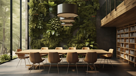 Eco-friendly Office Meeting Room interior with Biophilic Design Elements. Big blank TV screen. Generative AI