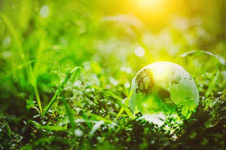 Planet earth model in green grass. Ecology, atmosphere and environment concept.
