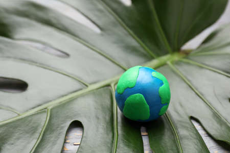 Happy Earth Day. Planet made of plastic on green leaf, space for text