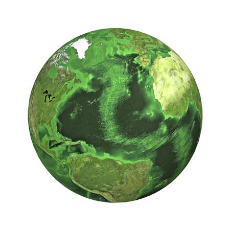 A green globe with tree and leaf-like continents, situated on a small island surrounded by light green water, symbolizing the environment, sustainability, and ecosystem preservation.