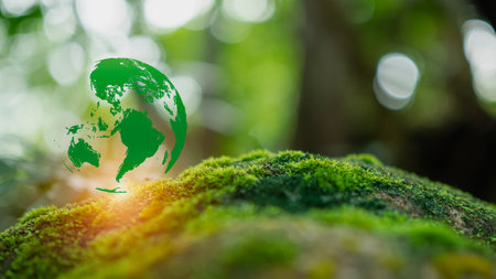 A glass globe depicting Earth rests on moss, surrounded by greenery. A tree tops the globe symbolizing environmental protection.