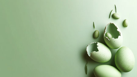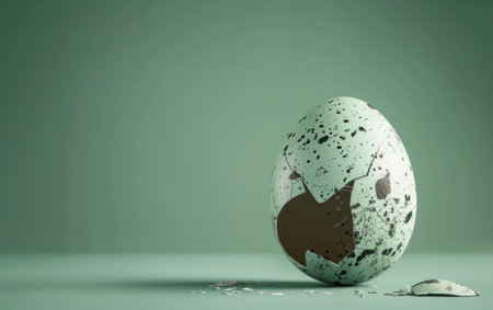 Two cracked eggs on vibrant green background with paper, symbolizing fragility and impermanence, concept of broken dreams and lost opportunities