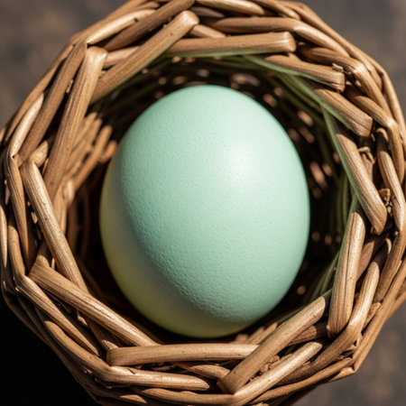 An editorial, hyper-detailed square image centered on a miniature, pale blue speckled egg (represent