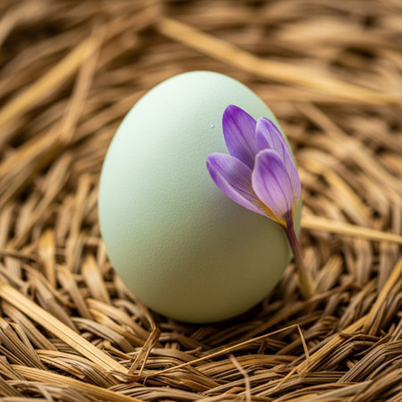 A pastel green egg is placed gently on soft, pink fabric surrounded by white floral accents, creating a tranquil atmosphere perfect for spring.