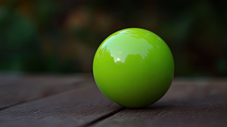 This image features a vibrant green glossy sphere resting on a wooden surface, creating a striking visual effect. The soft focus background enhances its appeal, evoking a sense of nature and tranquility.
