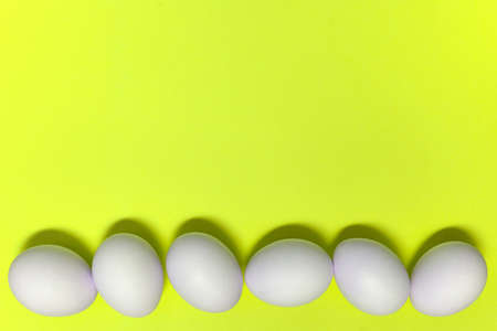 Row of white easter eggs on yellow background, copy space. Healthy food concept. Top view, flat lay. Happy Easter concept