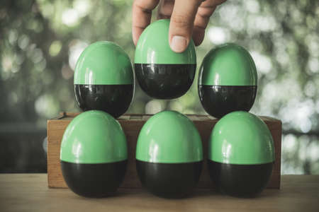 Hand randomly pick black and green plastic egg or egg surprise toys. Concept of egg surprise