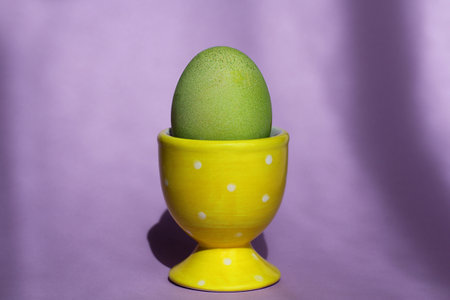 a bright green Easter egg in a special stand on a purple background. Easter decor.