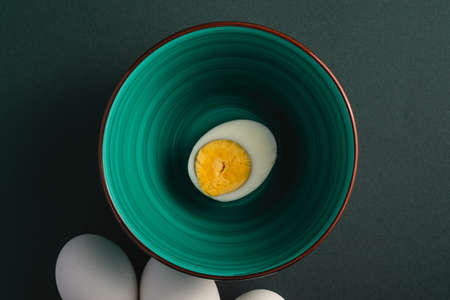 Boiled egg with yellow yolk in green bowl near to white eggs on dark moody black plain minimal background, top view, happy Easter day