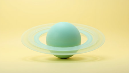 Minimalistic teal ringed Venus model on pastel yellow backdrop evoking dreamy celestial atmosphere
