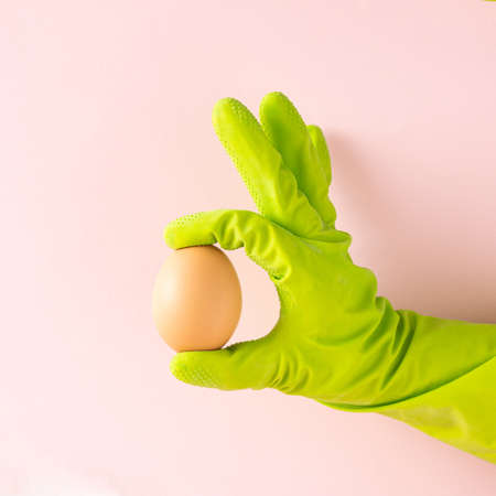Hand in green gloves holds and show egg. Minimal Easter arrangement on bright pink background