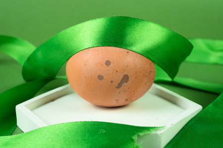Easter egg with a green ribbon on a green background close up