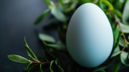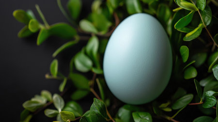 A smooth blue egg is nestled among fresh green leaves on a dark surface, creating a serene spring atmosphere that highlights nature's beauty and tranquility.