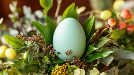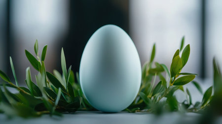 A delicate blue egg is positioned among lush green leaves indoors, illuminated by soft daylight streaming through windows, creating an elegant ambiance.