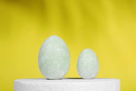 Easter eggs on a white stand, on a yellow background with shadows. Creative Easter background. Minimalism. Copy space