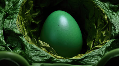 A beautifully crafted green egg sitting on a rustic wooden surface, softly illuminated by natural light. Perfect for decoration or culinary inspiration.