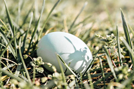 A solitary pale blue egg is nestled within vibrant green blades of grass, casting a delicate shadow