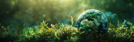 A small, detailed globe representing Earth rests on a bed of green moss, with sunlight shining through the background. The globes continents are visible, emphasizing the planets interconnectedness with nature. The scene evokes a sense of tranquility and the importance of environmental protection.