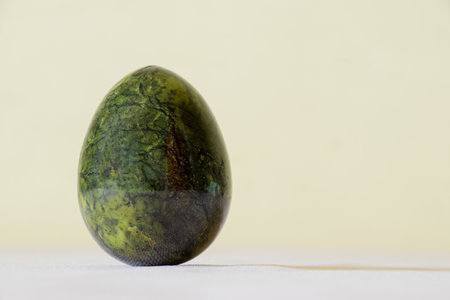 Green jasper stone egg on table on yellow background close up