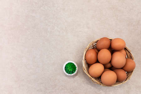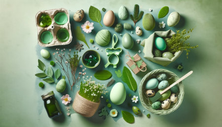 flat lay composition of eco Easter decoration and Easter eggs. An eco-friendly Easter design showing natural, biodegradable or recycled materials for Easter decor.