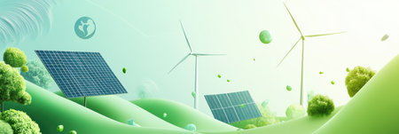 This colorful design showcases renewable energy sources including solar panels and wind turbines, set against a minimalistic green background.