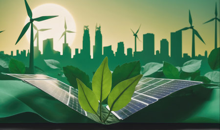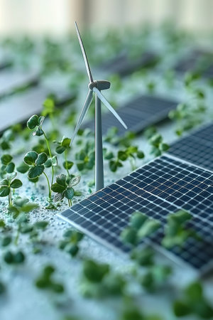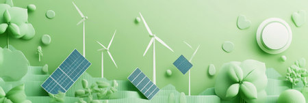 Solar panels and wind turbines contrast with abstract green patterns in a minimalist environment emphasizing renewable energy.