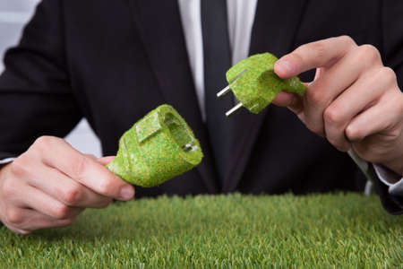 Close-up Of Businessman Hand Holding Grass Covered Electric Plug And Socket