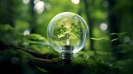 A glowing lightbulb contains vibrant green leaves, symbolizing eco-friendly solutions and the importance of sustainability in energy production for a healthier planet.