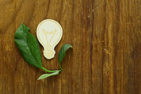Eco lightbulb from green leaves top view. Renewable and saving energy concept. Ecology and environment sustainable resources conservation.