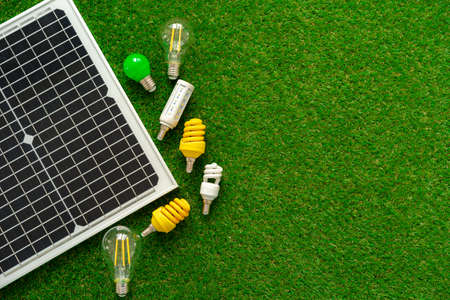 A fluorescent light bulb in sunlight on green nature background. Green business, economy, eco-industries start up ideas innovation background . Go Green to minimize human impact on environment concept