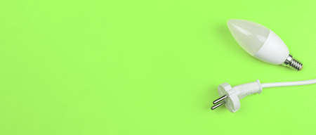 Saving energy, eco concept. LED light bulb and electrical power cable, green background, banner, top view and flat lay with copy space photo