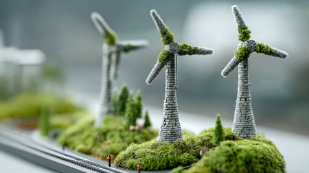 Miniature diorama of wind turbines on green terrain, symbolizing clean energy and environmental sustainability.