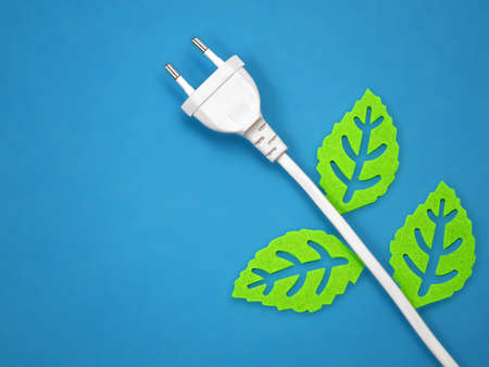 white power plug with green leaves isolated on blue background, concept image of green ecological energy