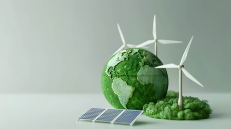 Earth with renewable energy elements such as wind turbines and solar panels, AI generated