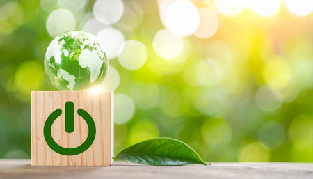 Green electricity socket with leaves, sustainable renewable energy, csr concept, environment protection, eco technology