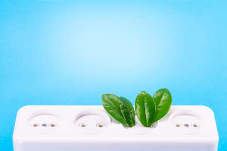 Green electric extension socket with fresh leaves top view. Renewable energy, eco or green power consumption concept.