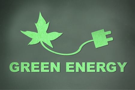 Green leaves arranged to spell green energy, symbolizing sustainability.