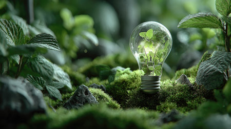 A bright light bulb emerges from lush moss, showcasing a young plant growing within, representing innovation in renewable energy and sustainable living practices.