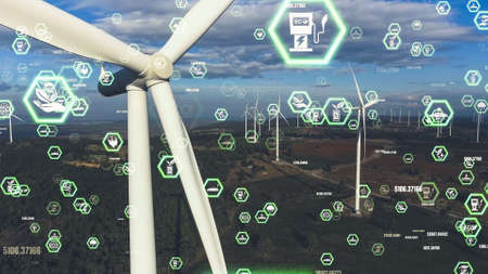 Wind turbines with digital visualization of wind and the inscription green energy on blue sky. Concept of green renewable energy. Wind farms generating clean energy in an environmentally friendly way