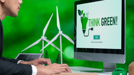 Businessman working in office developing plan or project on eco-friendly alternative energy with solar cell technology display on computer screen for greener environment as apart of CSR effort. Gyre