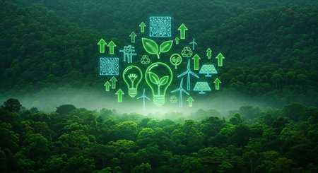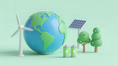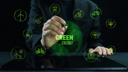 A visual representation of green energy concepts; a hand illustrates sustainable technologies around a digital globe with symbols for eco-friendly solutions and innovations.