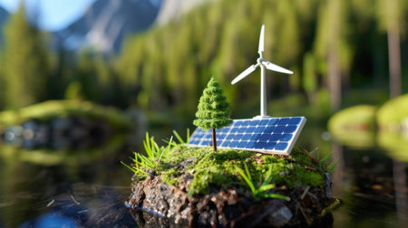 A creative display of eco-friendly technology featuring a solar panel, a wind turbine, and a miniature tree on a mossy island, emphasizing sustainability and nature's beauty.