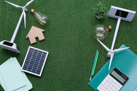 Frame made of wind turbines, solar panel, light bulbs and notebooks on grass. Green Energy concept
