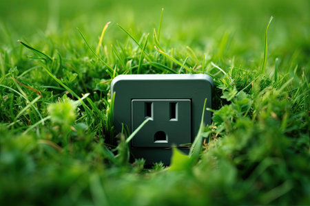 Close view of a green plug plugged into an electrical outlet located on a patch of grass.