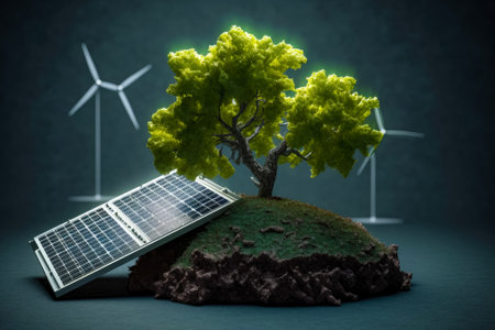 save the green planet concept. Illustration of green tree and solar panels on background of windmills. Space for text. green energy concept. Generative AI