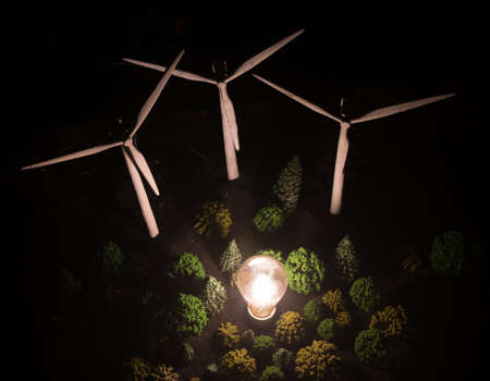 Electricity power in nature or clean energy concept. Wind Turbine producing alternative energy at night. Glowing bulb powered by alternative energy. Selective focus