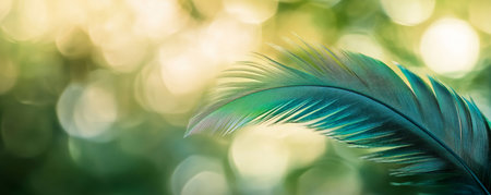 Colorful feather on blurred green background, nature tranquility and softness concept