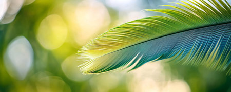 Close-up of a tropical palm leaf with sunlight and bokeh effect, nature tranquility concept