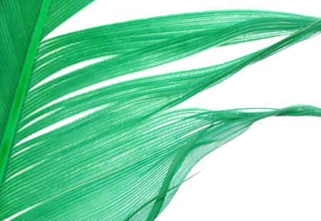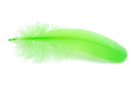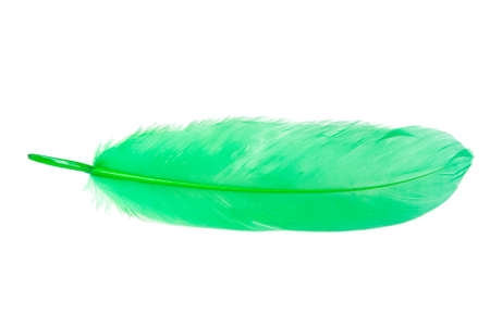 A single, vibrant green feather is shown against a white background. The feather has a distinct central quill and a series of fine barbs. One end of the feather is smooth and pointed, while the other end has a jagged, somewhat frayed edge with white highlights. The texture of the feather is clearly visible.