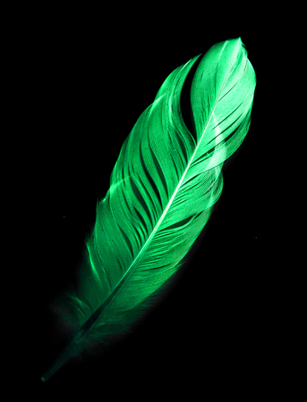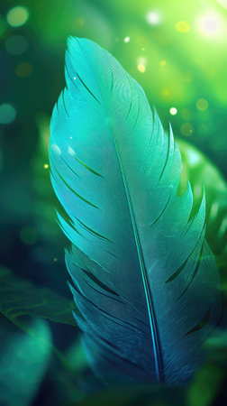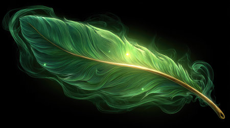 An isolated image showcases a vibrant green feather, detailed with intricate textures and illuminated with a soft glow. The feather appears to be floating against a dark backdrop. The composition evokes a sense of fantasy. Ideal for commercial use in design projects or conceptual illustrations.